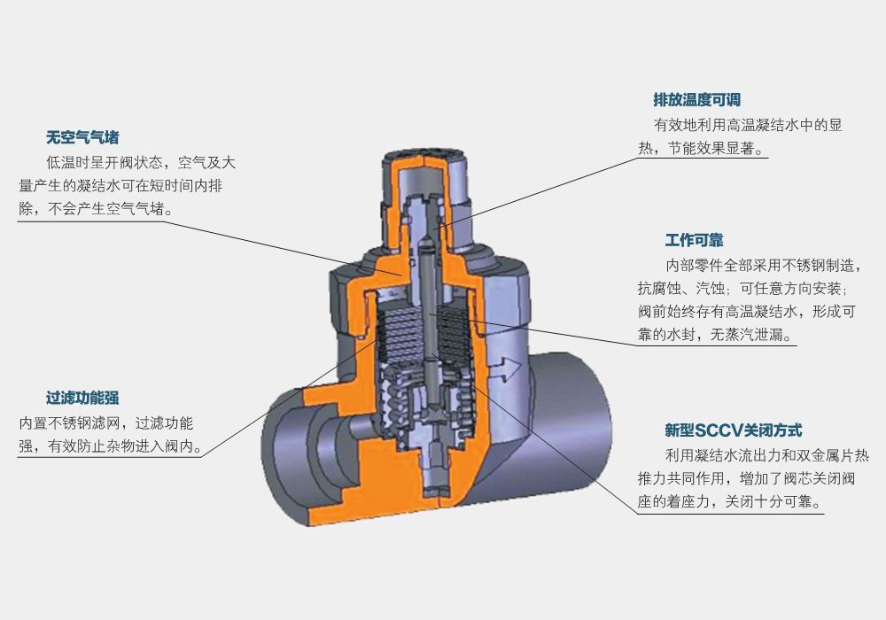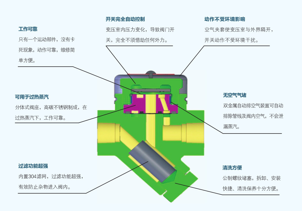 熱靜力型蒸汽疏水閥通常由閥體、閥蓋、彈簧、活塞、密封圈等部件組成,利用熱脹冷縮原理,以及水在高溫下的膨脹速度快于蒸汽的優(yōu)越性,形成疏水閥的工作原理。其中,閥蓋上有一系列壓縮彈簧,彈簧下端與活塞相連,上端與閥蓋相連,當工作介質(zhì)中的水位高于設定值時,水將進入閥體,推動活塞上移,壓縮彈簧使閥門關閉;當工作介質(zhì)中的水位低于設定值時,彈簧推動活塞下移,打開閥門,將水排出。