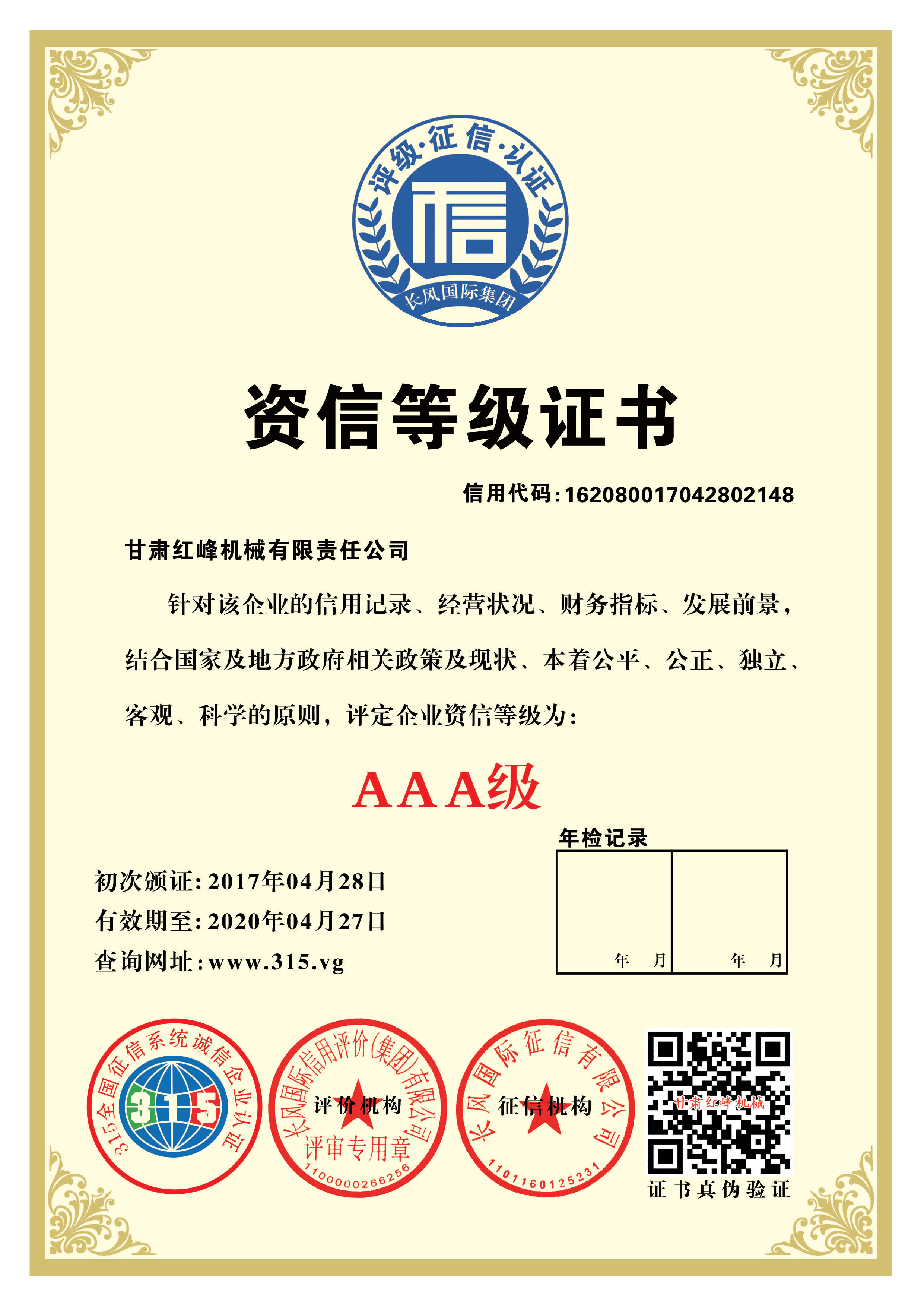 資信等級AAA證書